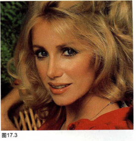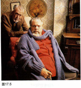 在表现约翰·休斯顿(John Huston)和奥森·韦尔斯(Orson Welles)的这幅照片中(图17.5),从韦尔斯的雪茄和时髦的围巾到休斯顿生气地紧皱的眉头,这两位满脸皱纹,已经过世的专家的个性栩栩如生、跃然纸上。他们面部过多的光是明亮的阳光通过右面的窗户投射的结果。你如果将这幅照片作“家庭人像”拍摄,你就要减弱这种光或给阴影部分增加辅助光。但是,作为一幅“个性研究作品”,这幅照片得益于过多的自然光产生的真实“感觉”。这幅照片具有一种现场光的效果,只有取代过多的阴影,它才能有过多的亮光。