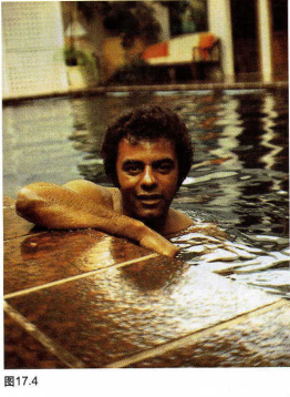 歌唱家约翰尼·马希斯(Johnny Mathis)喜欢在他的室内游泳池游泳(图17.4)。你能发现什么比较好的道具吗?自然光从左面的一扇大窗户照射,你如果从游泳池边拍摄,我们需要提醒你,当你将室内交流电作照明电源时要特别小心。最好坚持用自然光或电池供电的闪光灯。