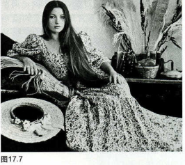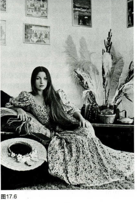 使画面简洁的第三种方法是将一切多余的部分剪裁掉。例如,图17.6和图17.7的两幅照片,观察通过简洁的原则,简单的剪裁是怎样改进照片的。墙上的绘画容易转移观众视线和注意力,将它们剪裁掉后,我们把注意力集中在被摄者身上,只将那些经过认真选择的道具保留在画面中,从而增加了被摄者的魅力,使这幅人像得到了成功和生动的表现。认真检查这幅照片中的道具——长袜子、草帽、毛绒绒的围巾、羽毛、芦苇饰品和书籍……这些东西告诉我们有关这位被摄者什么情况呢?你是否认为她的面部表情与她的周围环境所传达的信息保持一致?