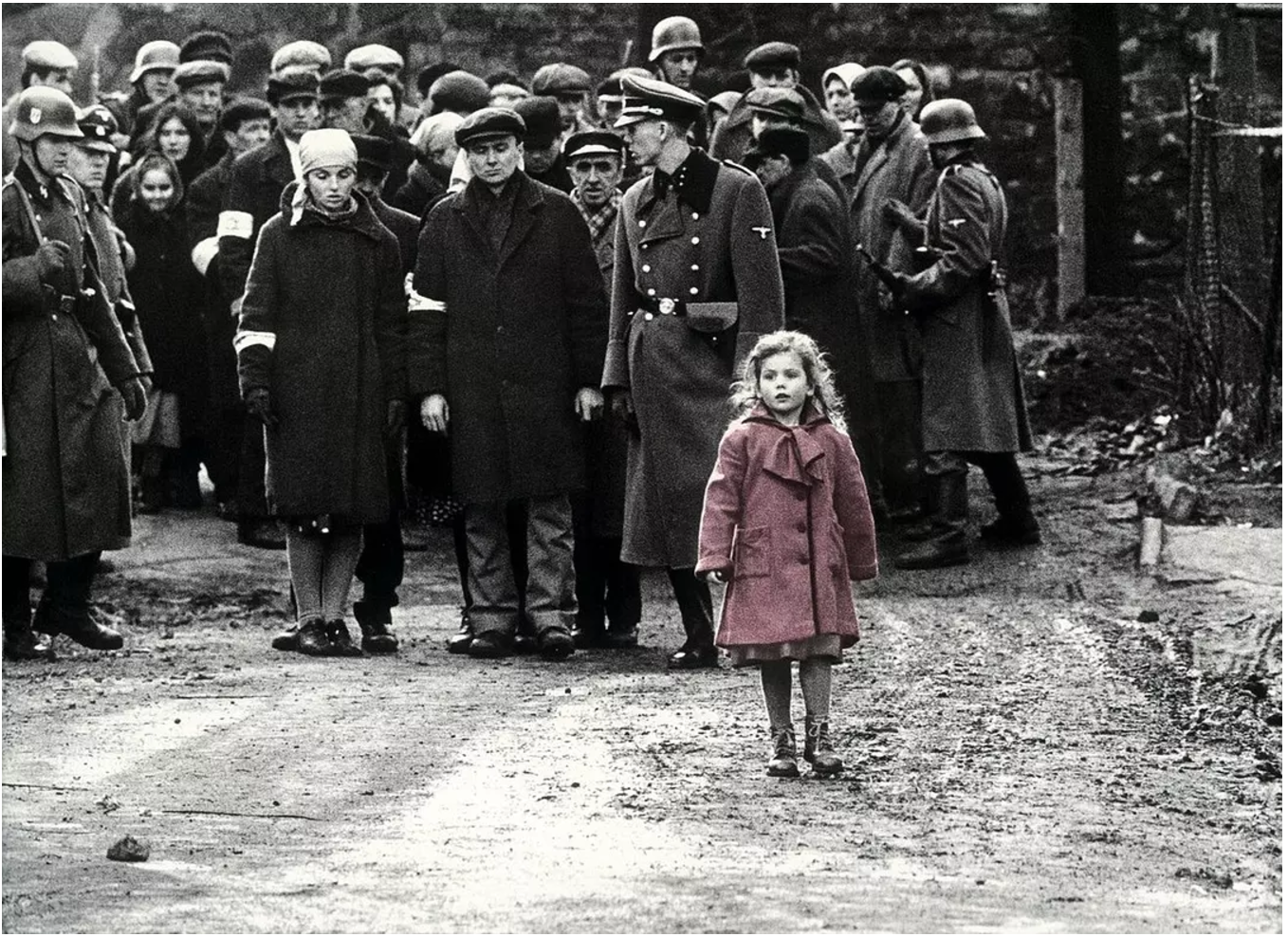 在转折性的“山顶俯视”画面中,辛德勒才第一次(之前他要么沉溺于歌舞升平,要么在家尽享床第之欢)目睹犹太人被大肆屠杀的惨状。我们都通过他的目光“俯瞰”,并觉察了镜头特写下辛德勒神情的凝然骤变,并随着他的眼睛捕捉到逃窜的人群中一抹亮丽的“红色”。等到这抹红色再次出现,我们又一次跟着辛德勒注视她的目光,随着污秽不堪的推尸车远去……这时的辛德勒和我们一样,被这唯一的彩色的消逝震撼了,他不仅怀着良不安、愤怒和无奈的情绪,而是确定下了拯救受害者的决心。