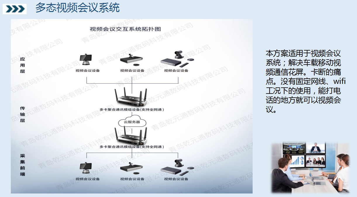 本方案适用于视频会议系统;前端摄像头采集会议现场画面,经过主机编码后通过聚合路由器四张网卡上传到云端服务器,由云端服务器分发到每一个终端(即手机端、电脑端、指挥中心大屏)实现远程视频会议。方案适用于没有固定网线、wifi工况下的使用,能打电话的地方就可以视频会议。