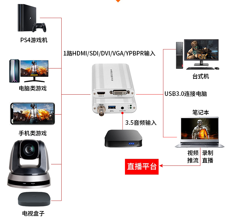 多接口HDMI+DVI(VGA、YPbPr、AV)+SDI音视频输入采集盒(器)