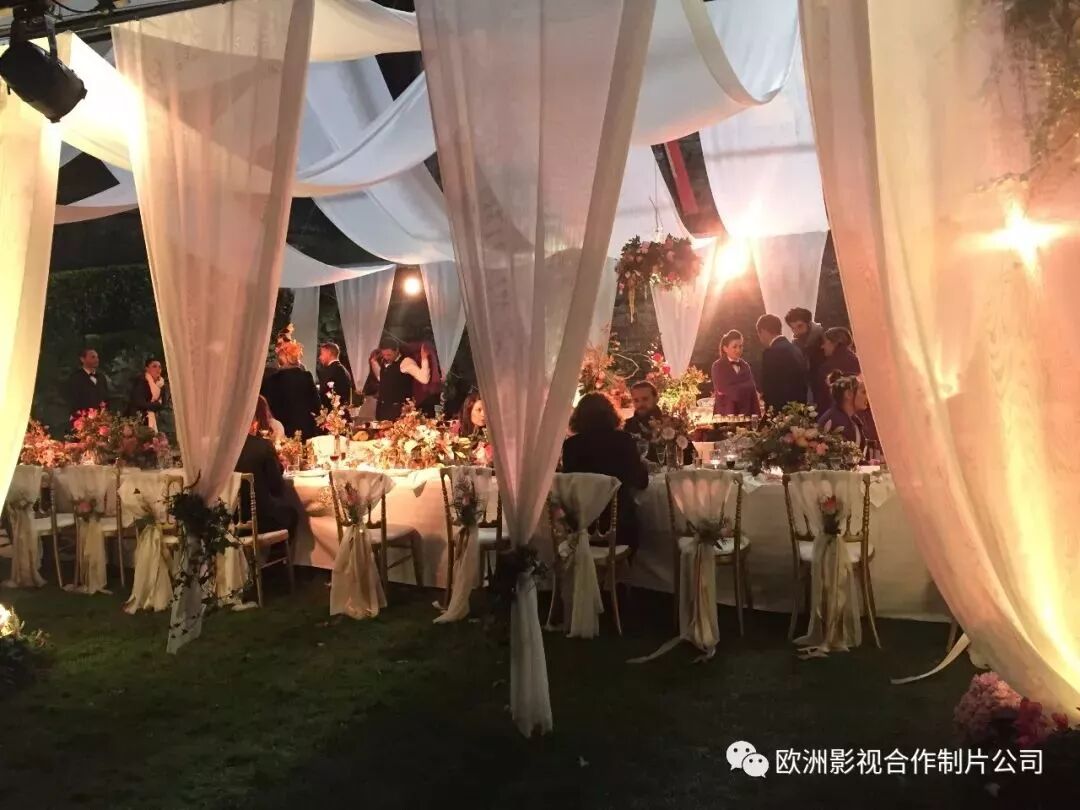 剧中奢华的婚礼场景表现在方方面面。宴会部分按照剧本和美术的要求,需要临时搭建的金属结构的帐篷,配以纱幔和鲜花点缀,极具浪漫气息。