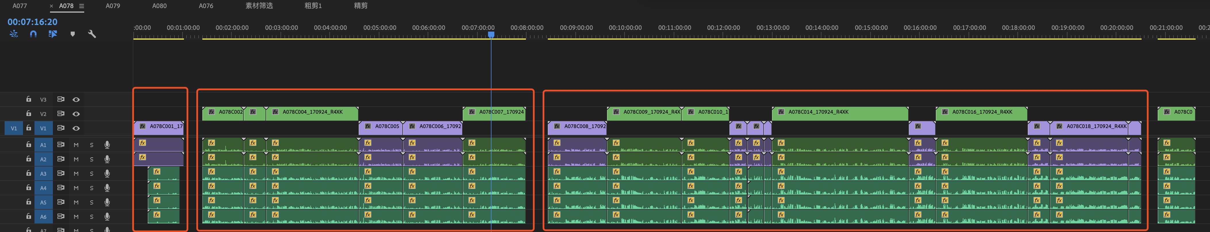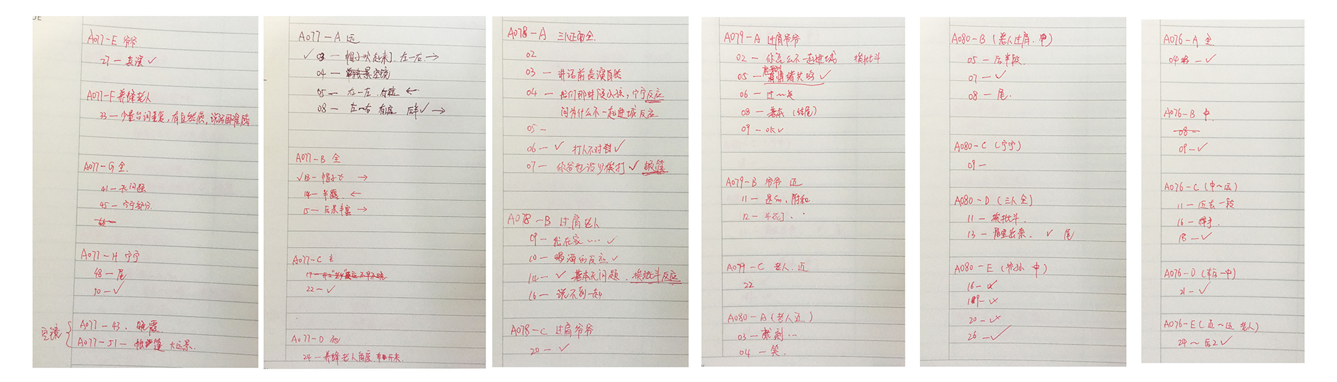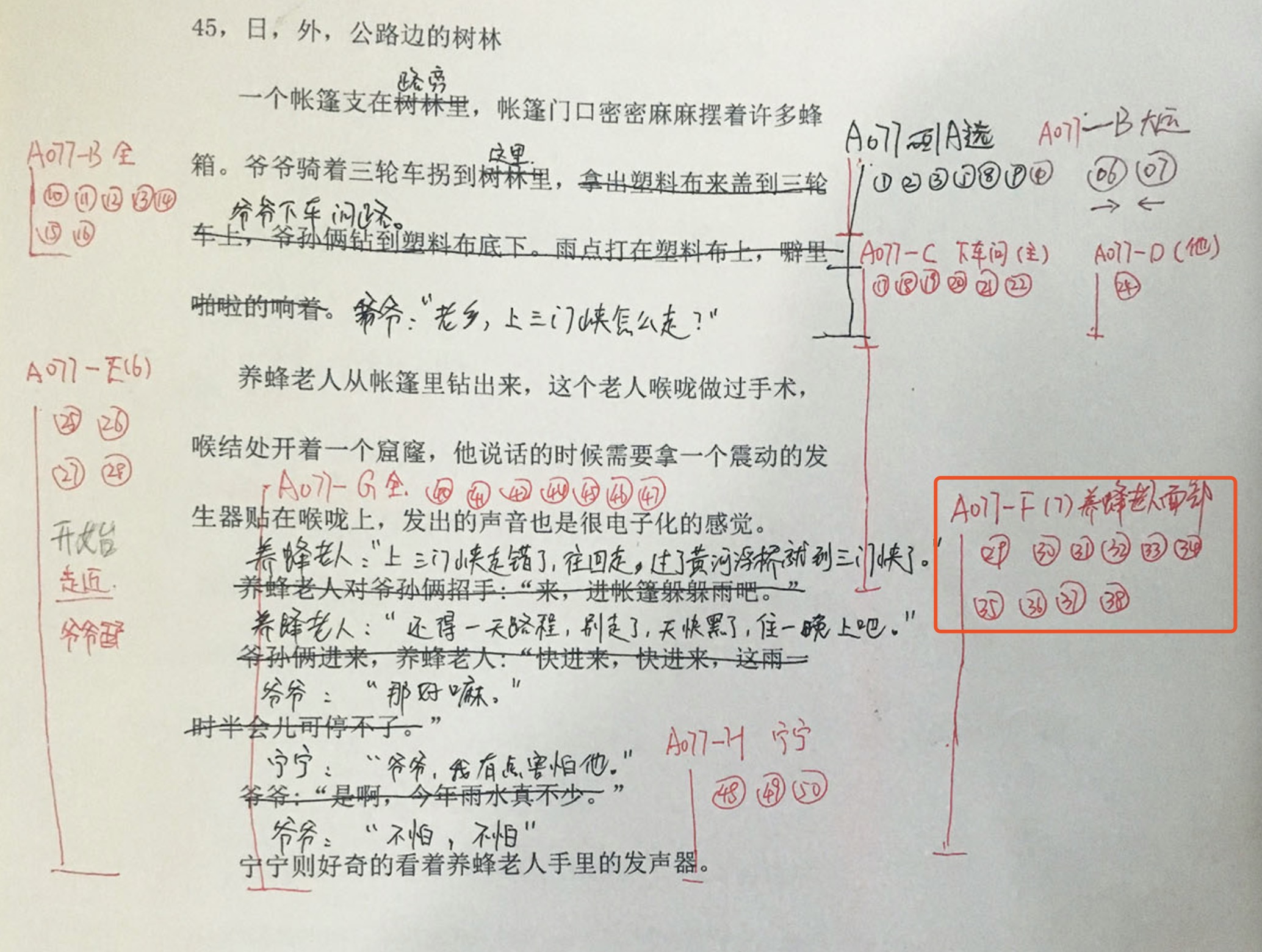 - 根据拍摄的运动方式和景别,把素材做了简单分类,按照“A078-A/B/C/D-全景/中景/过肩”这样在剧本上简单标记(方便查看拍摄了哪些内容)