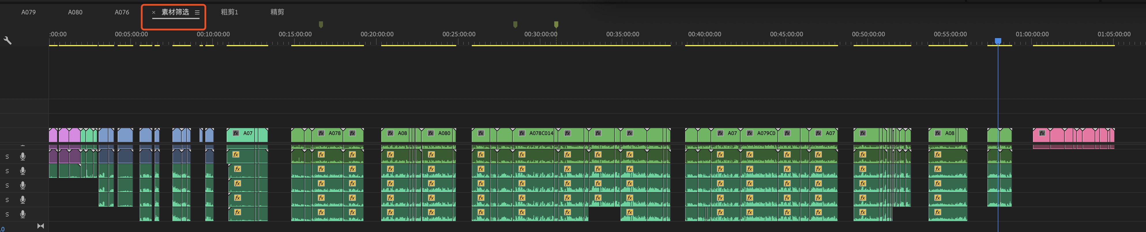- 分类好后,在时间线上浏览每一条拍摄的素材,记下可用的素材,如下: