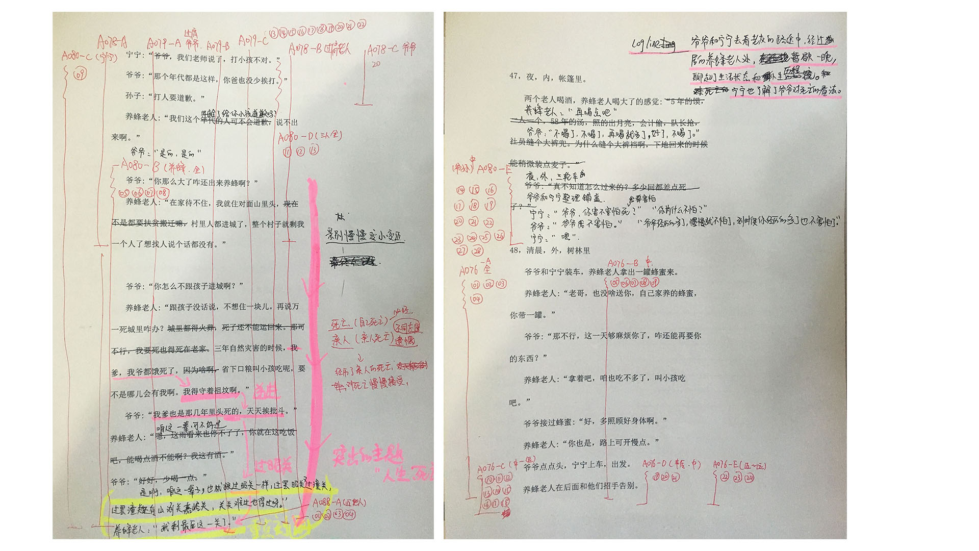 养蜂老人和爷爷的对话是这段剧本的重点,两人相互的对话中,渐渐有了共鸣,聊的越来越深入,从生活状态、亲人到经历、死亡,层层推进。