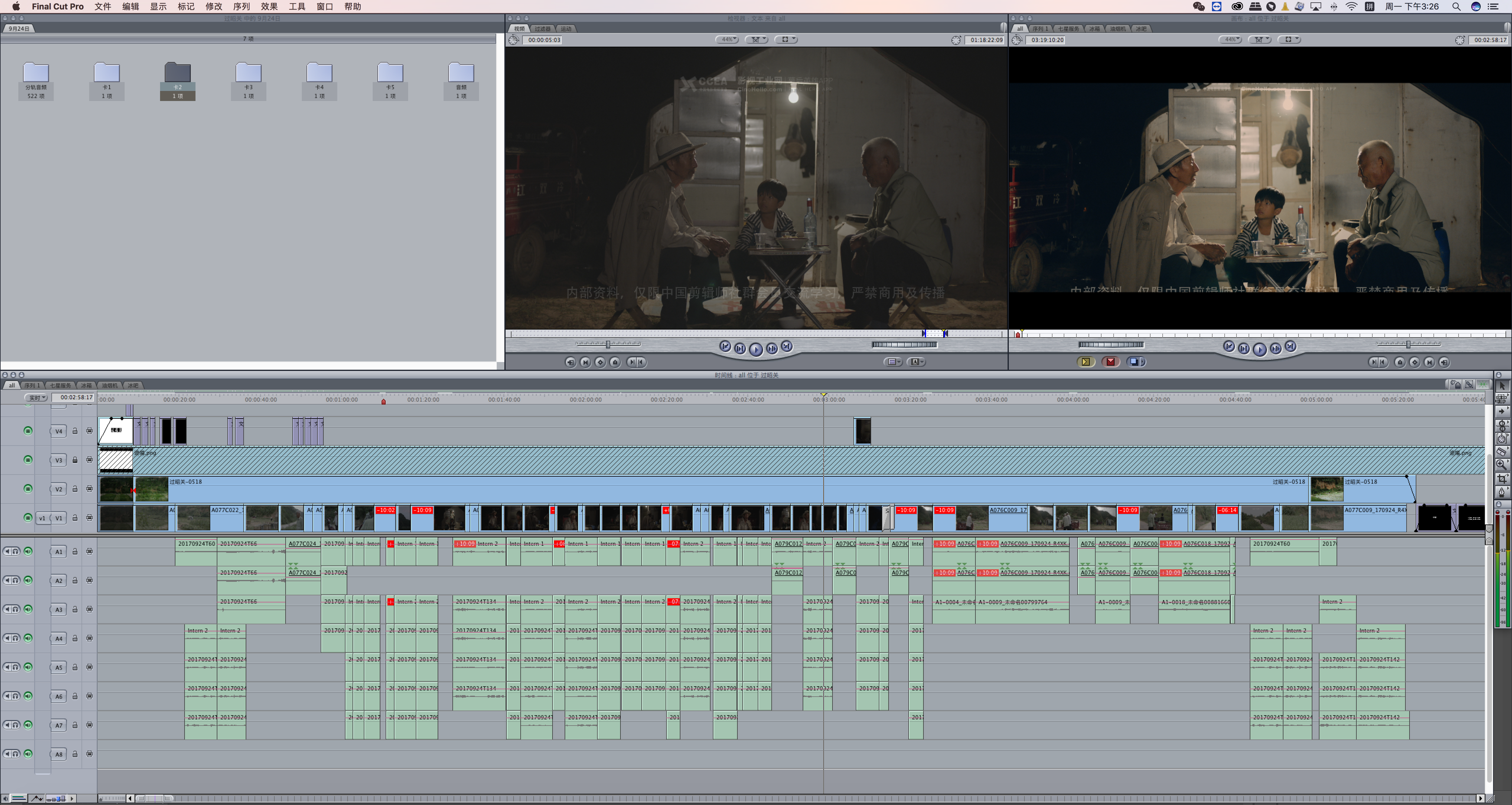 首先是看剧本,我们拿到了三场戏,如果这三场戏放在整个电影中可能要考虑整体电影的风格气质以及承上启下如何进行衔接,但是,如果观众没有看过《过昭关》这部电影,只看这三场戏的话,作为剪辑师,需要做的是如何把这三场戏进行重新架构,让观众通过三场戏能了解一个完整的故事,而不是简单的三个场景片段。