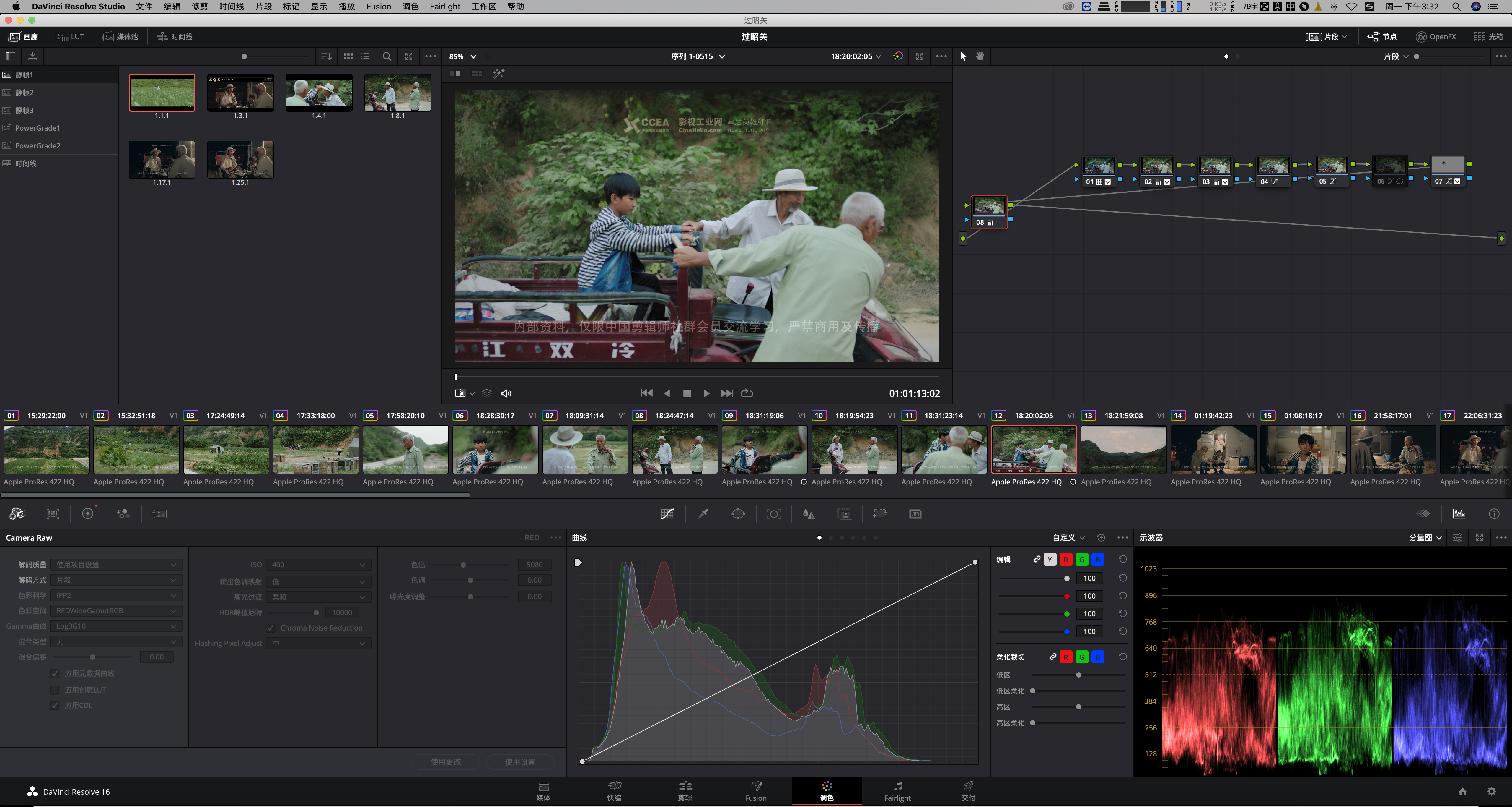 调色主要是用达芬奇进行xml套底原素材 对照小样查缺补漏,然后根据摄像机厂牌加载对应lut进行空间转换,最后进行一级、二级校正