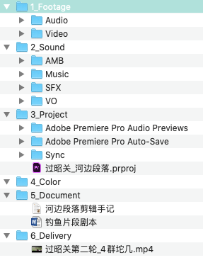 在剪辑开始,我会在项目文件夹里建立几个子文件夹, 包括素材、工程、声音、代理(如需要)、文件、调色、输出,这样素材管理起来比较清晰。