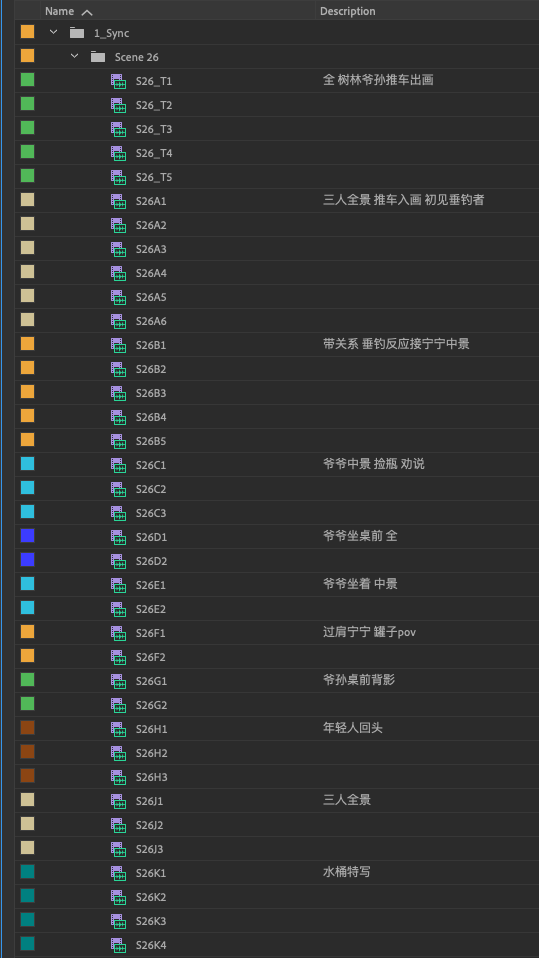 主要通过拍摄对象和景别来区分。比如片段中的三人全景会用土黄色,二人片段是绿色,爷爷的镜头使用蓝色,宁宁使用橘黄色,年轻人使用棕色,如果遇到有问题的镜头会用玫红色标明。