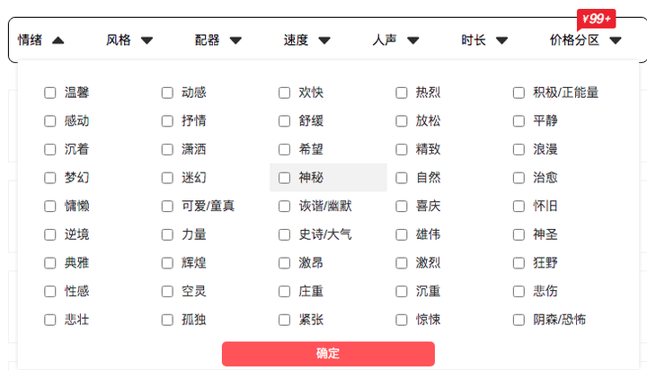 您可以通过1BGM的标签搜索引擎,进行多个音乐标签的重叠筛选。音乐标签分为6种:情绪、风格、配乐、速度、人声、时长。1BGM拥有超过500个音乐标签,细致描述每一首音乐的特点。
