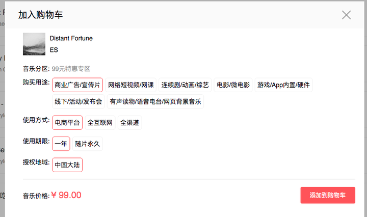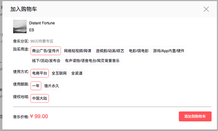 我们网站上以电商的形式的进行音乐授权,在线交易。根据项目授权用途、渠道、年限单次授权,价格从200元到2000元不等。更有不限授权不限渠道永久授权的99元特惠音乐供用户选购。购买音乐只需要将音乐需三步,加入到购物车 -> 填写项目信息 -> 在线支付。支持开具发票,提供授权证书。