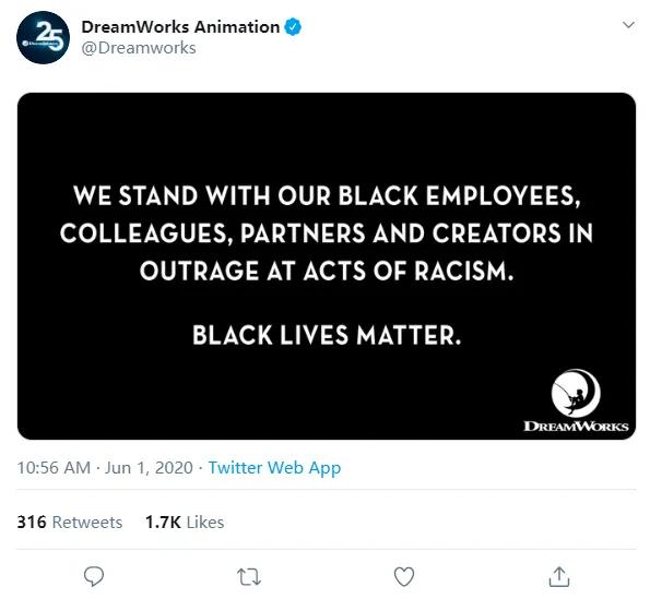 好莱坞多家动画公司于当地时间 6 月 1 日发布推特,表示坚决反对种族歧视,支持自己的黑人员工、合作伙伴、故事创作者,以及整个黑人群体。呼吁大家联合起来为平等发声。