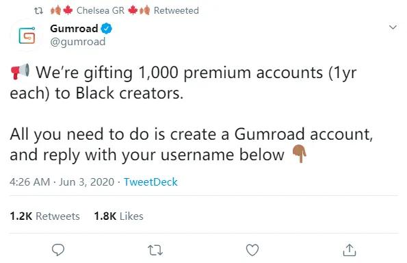 除此之外,一些动画相关网站自发的为黑人艺术家们提供福利。艺术家线上售卖作品网站 Gumroad 宣布,将免费为 1000 名黑人艺术家提供网站为期一年的高级账户。