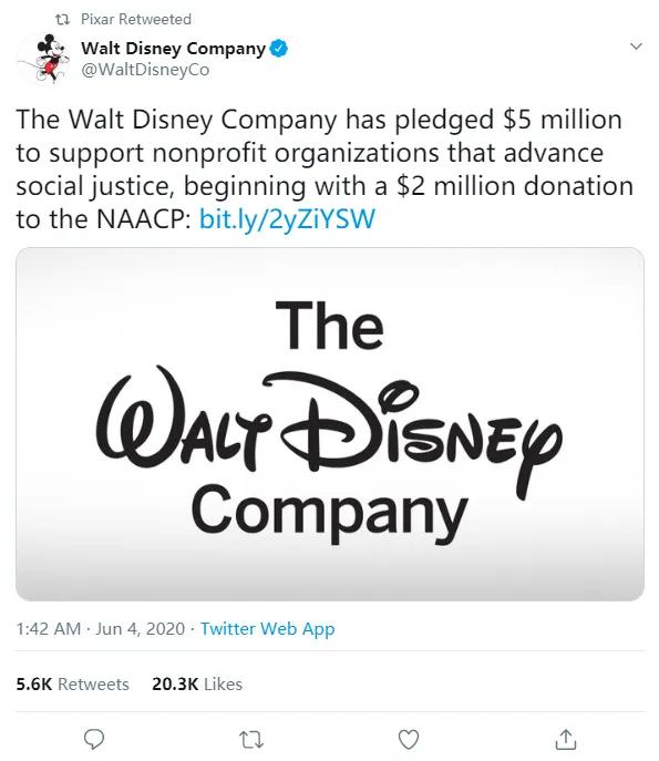 截止当地时间 6 月 4 日,迪士尼公司已认捐 500 万美元,用以支持促进社会正义的非营利组织,NAACP(美国全国有色人种协进会)已获得其中的 200 万美元。