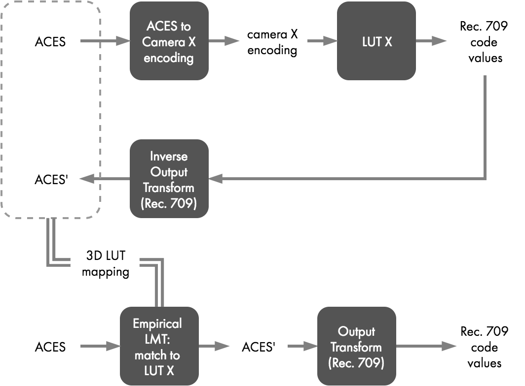 假设该LUT为某供应商提供的渲染LUT,我们称为LUT X,其目的为将品牌X摄影机中的X-log数据转换为Rec.709。与上例PFE的流程非常相似,经过IDT的来自X摄影机的RGB原色集数据结合X-log会被逆转换为ACES数据,即回到AP0色彩空间从而获得ACES值,然后该值转换为X摄影机编码并经过LUT X转换为Rec.709值,最后通过逆向ODT生成ACES'值,再将该值与输入的ACES值打包一起保存为3D-LUT。看看,与胶片流程并没有太大区别。