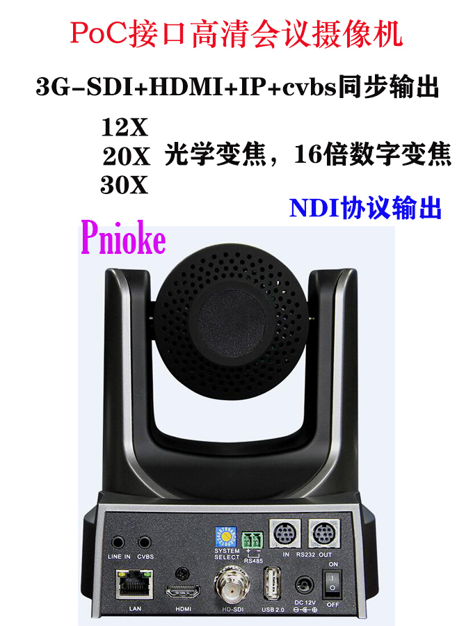 派尼珂Pnioke NK-POC502020X高清视频会议摄像机,是一款多功能多接口输出的视频会议摄像机,500W像素逐行扫描CMOS图像传感器,20倍广角高清镜头,1080P60FPS输出。3G-SDI数字接口支持POC远程传输功能(集成同轴数字高清视频影像、远端供电和控制信号于一线传输)。PoC(Power Over Cable)功能,电源、视频、控制三线合一,1080p高清传输距离长达150米以上,POC供电系统可以为工程集成商提供更为便利的施工方式,简化布线,降低成本。可解决前端设备单独供电难的问题,实现集中供电,可同时实现视频、控制信号的传输以及对摄像机进行供电的要求,在视频会议工程、教育录播工程中广泛使用。配合配套的录播主机使用,精简工程安装。便于维护。采用进口精密低噪音低功耗电机设计,颜色有灰黑色和白色可选,支持吸顶倒装、壁装方式、三脚架等安装方式。