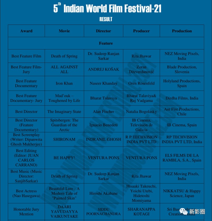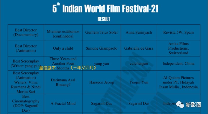 其中,新影圈作为印度世界电影节在中国的独家征片评审平台,所推荐的影片中最终两部影片获奖,三部获得最终提名。
