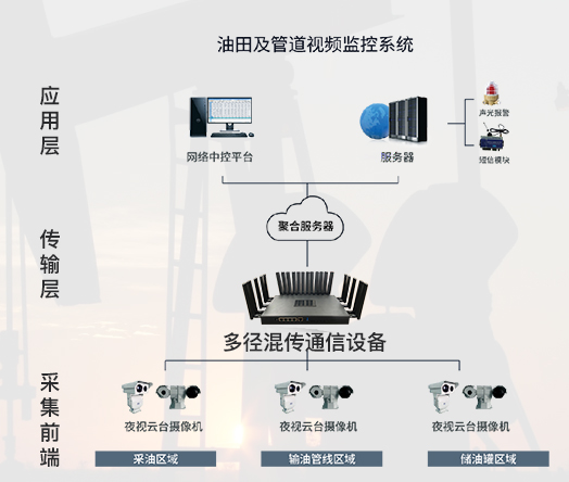 油田及管道视频监控和安全检修,与指挥中心的实时视频数据回传,形成远程可视化的指挥系统。