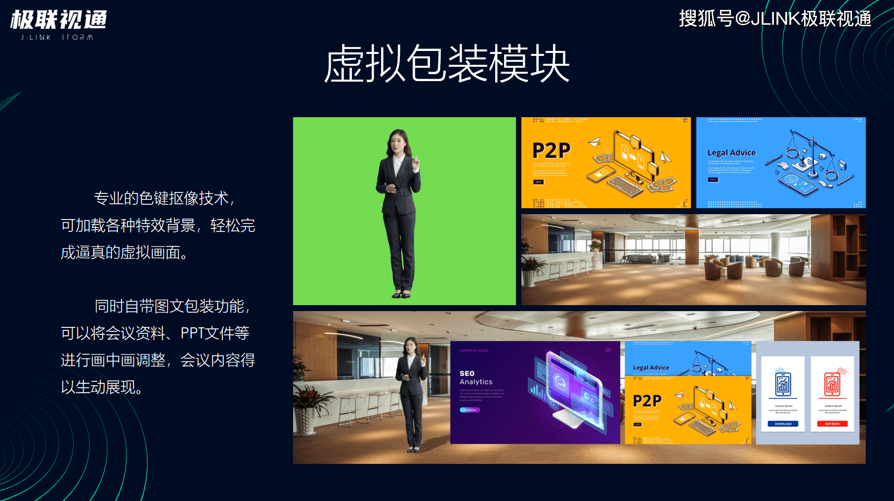 极联视通的虚拟演播室解决方案以自主研发的MOTO 系列一体机为核心,集成世界一流的专业硬件和多种功能于一身的系统。可以实时完成抠像、图片、视频等元素添加的添加、实时人物美颜效果、多种不同码流直播、多种字幕特效及虚拟场景运动调试等,使真实人物和虚拟背景能够同步变化,获得完美的合成画面。为用户提供无限的创作和创意空间,满足用户对新闻报道、娱乐综艺、体育赛事、气象报道和教育行业等多场景应用需求。