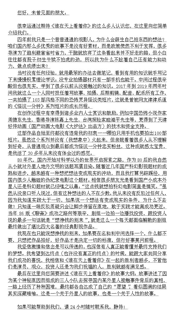 原创国产小成本外星人题材伪纪录电影《谁在天上看着你》目前需要拍摄资金,我是这部电影的编剧导演,这是写给投资人的一份公开信,恳请大家帮忙转发!