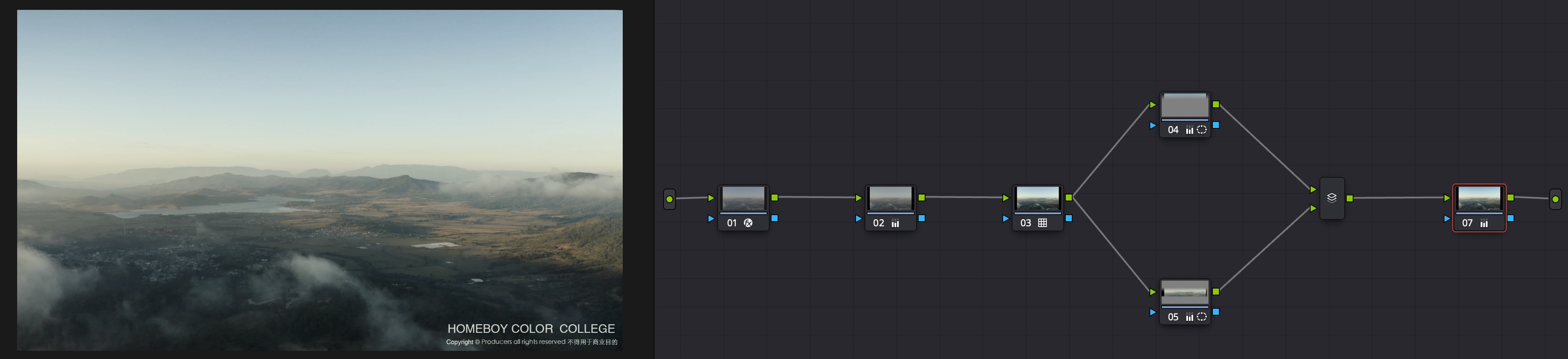 首先通过观察及波形图显示发现,航拍镜头及两个花朵镜头为709素材,在不明确摄影机型号情况下,通过达芬奇色彩空间转换工具,将其转换为logc后,与其他素材尽量匹配,再统一进行调色工作。