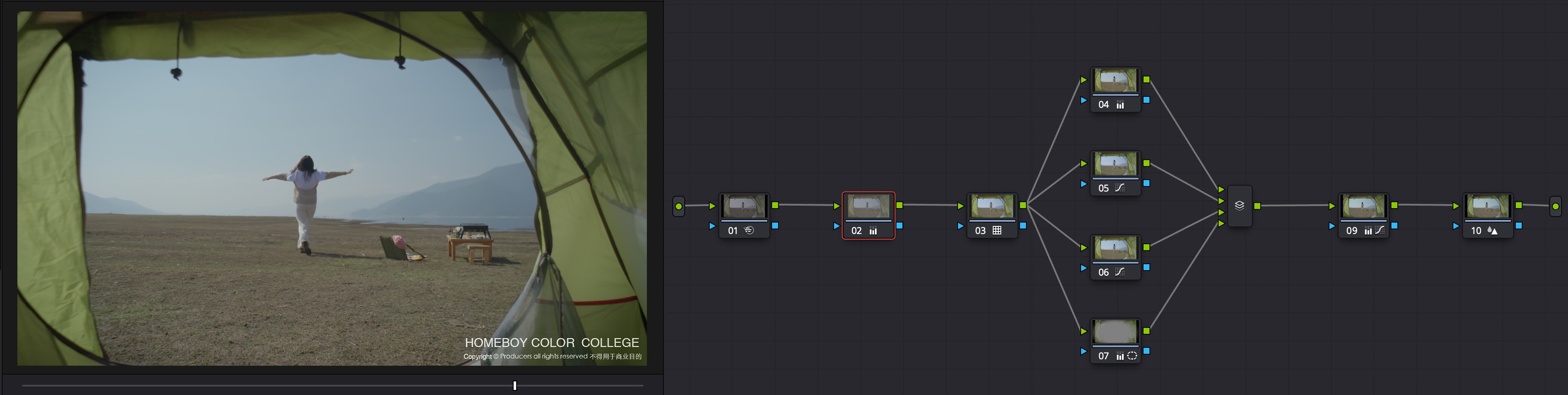 该广告片为红酒广告,但不同于其他红酒类广告,主打社交、礼仪场合,而是通过女主露营的场景,来表现次红酒产品融于生活,更闲淡舒适。所以,配合此广告片的剧情及场景设置,以及对导演如此拍摄的推测,在调色方面,我考虑更偏向于带有剧情性质的清新质感,既有露营的恬淡休闲,美女演员的甜美清新,又不一味追求低反差小清新风格,并着重突出了红酒在整个画面中的色彩厚度,提亮产品标签及logo的金色饱和,使观众能更明晰的感受到产品。