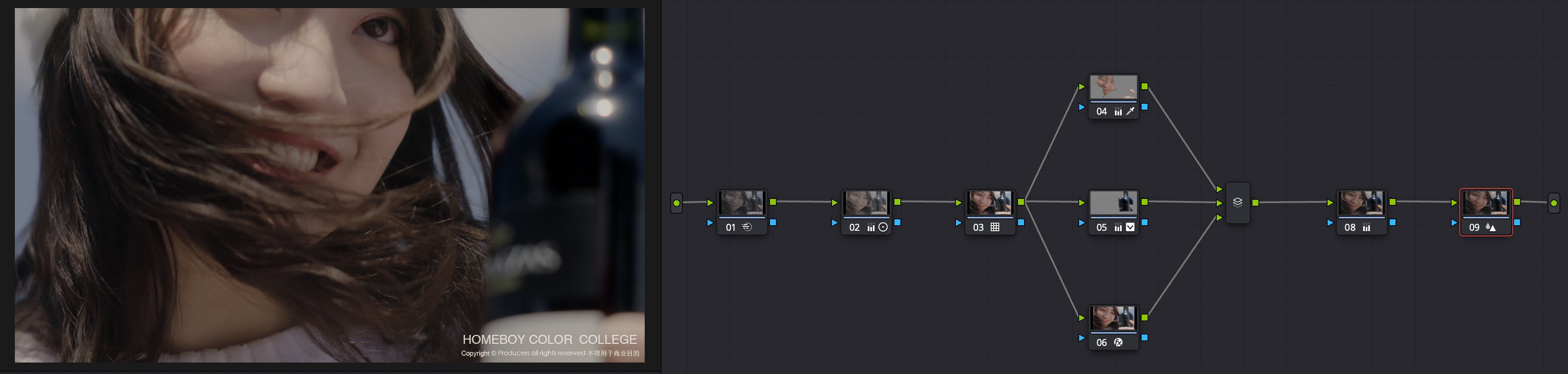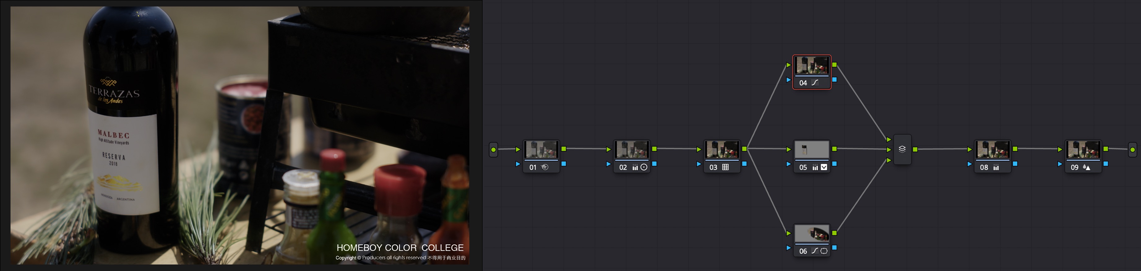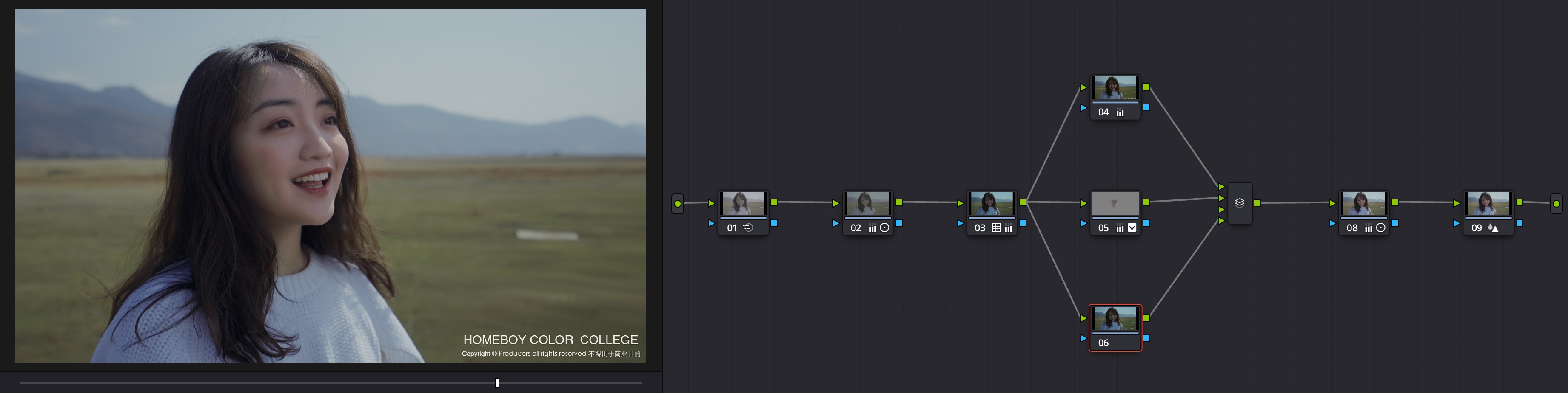 通过使用logc to 709lut,将素材转换为709色彩模式,然后在lut节点前通过通过lgg及其他一级工具进行素材的一级校色,创建反差、饱和等关系,校准白平衡。之后进行二级校色,突出画面中产品及演员,弱化杂色,对其他细节进行调整,然后进行整体影调的调整。最后在第一节点进行降噪,并在最后适当锐化以保留细节。