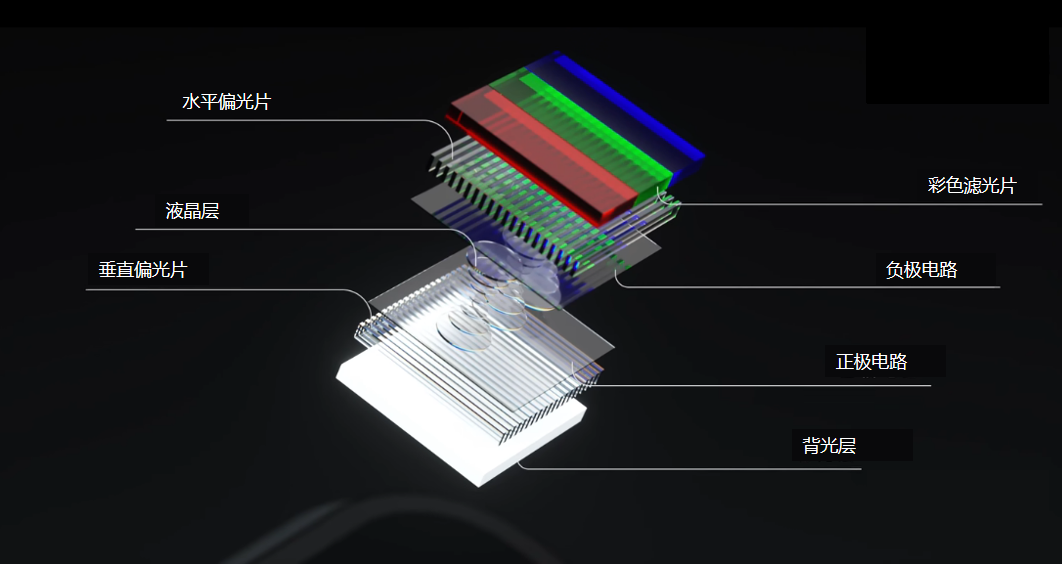 LCD本身不具备自发光特性,需借助其他光源来发光。目前一般使用LED作为背光。LED作为背光源发射的光是散乱的,需要通过偏振片将光调整为同一方向。偏光片和液晶层是整个LCD面板的核心层。液晶层就像百叶窗一样,通过控制电流的大小而改变液晶层分子的偏转角度,进而改变光线的亮度。当不同亮度的光线穿过彩色滤光偏,红绿蓝三原色比例改变,就可以混合出想要的一切颜色。