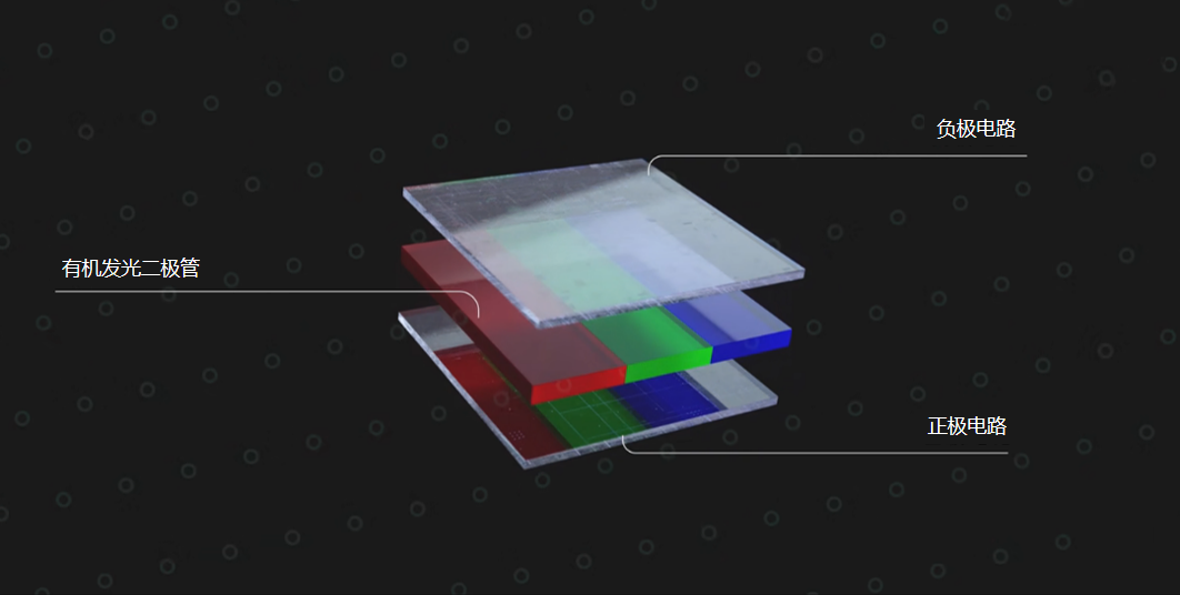 而OLED面板的发光原理就比LCD简单许多了,主要包括三层。OLED的光源来自自有的有机发光二极管,没有背光层和液晶层。每一个像素都由一个单独的电路独立驱动,只需要控制电流就可以改变每一个子像素点的亮度,进而得到想要的颜色。有机发光二极管的薄膜层厚度非常小,大概为0.1—0.15um(微米,相当于毫米的千分之一)。结构如下图所示。