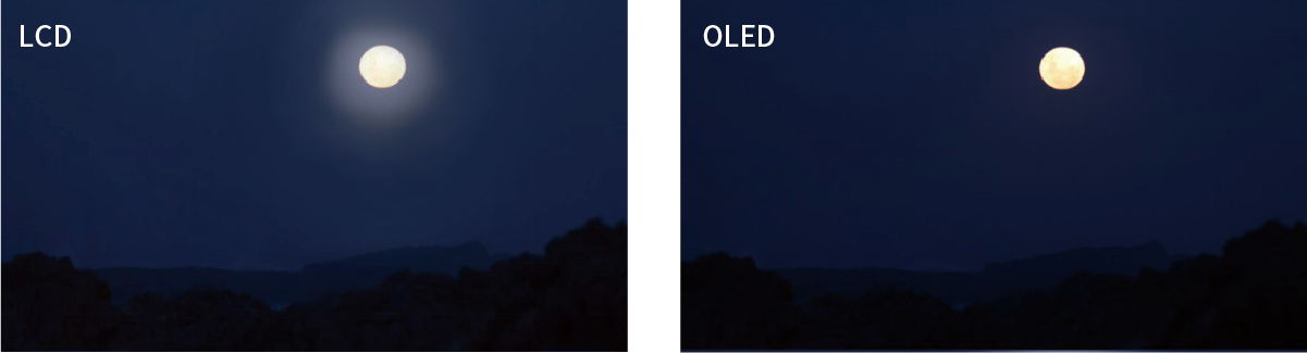 首先,OLED超高对比度,碾压LCD。由于OLED的自发光特性,每个像素点都可以独立控制,不需要像LCD面板一样点亮整块面板,通过控制液晶层分子偏转而改变颜色。在显示黑色画面时,LCD面板需要通过液晶层分子的偏转闭合,遮住背光层发出来的光,进而得到黑色。但液晶分子的偏转无法做到百分之百的完全闭合,总会有一些细微的白光泄漏出去。所以,LCD面板显示的黑色并不是真正意义上的黑色,而是带着微量的白光,看起来会有些许灰,黑白画面同时呈现时会产生光晕现象。