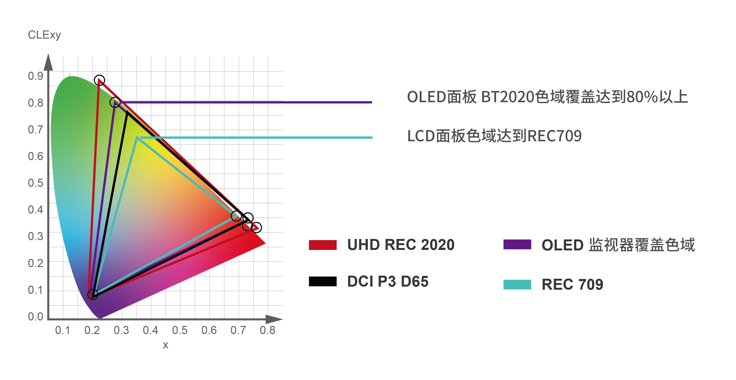 OLED监视器色域BT2020和LCD监视器色域REC709对比图示
