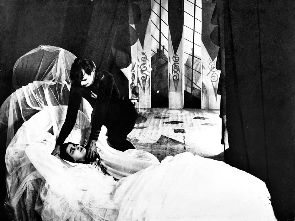 这 是德国表现主义电影的代表作之一,也是西方恐怖片鼻祖。表现主义是绘画名词,指艺术家通过作品着重表达内心情感,而忽视对象形式外在的摹写。在制作这部电 影布景的时候,艺术家直接在油画布上绘制场景——那些不成比例的抽象锯齿状建筑物以及随之产生的怪异光影效果,表达出了人物内心深处的恐惧和扭曲。