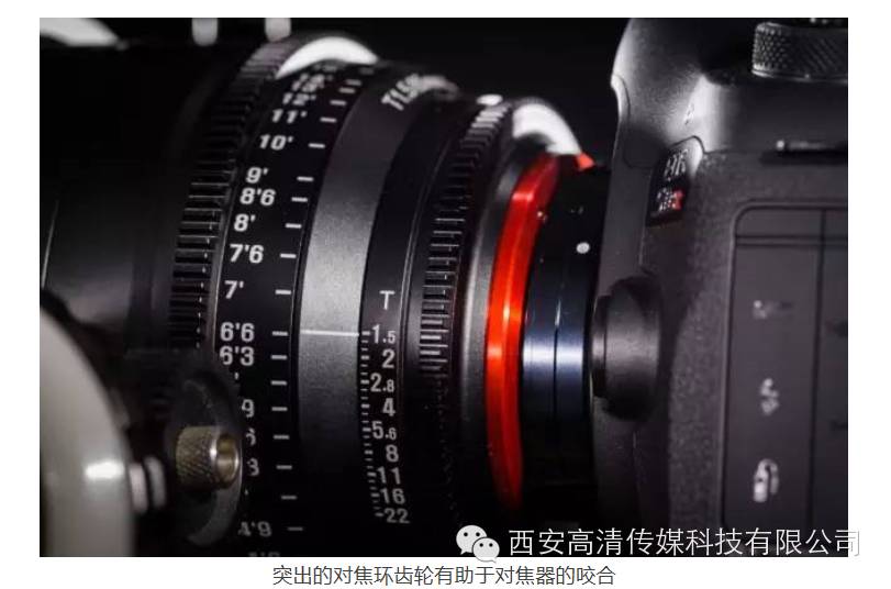 除了T制光圈以外,电影镜头跟普通镜头相比还有什么区别呢?我们来接着聊。还是回到它的外观上,电影镜头上突出的齿轮,能够更稳定的和外接跟焦器咬合,同时前后两面的距离标尺的设计也是方便了跟焦员或者摄像师本人进行对焦。与此同时,电影镜头的对焦行程相较普通镜头要长了不少,这样就有助于在拍摄过程中更加精准的对焦。