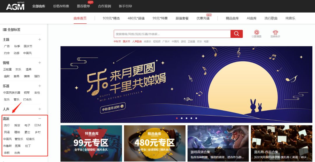AGM(曲多多)商用音乐授权平台,拥有和获授权近千万首音乐作品版权,平台作品覆盖流行、摇滚、乡村、古典等18个大类音乐流派,包含223种小类,网站精准定位的AI音乐流派标签,可高效便捷地帮你找到合适配乐作品。