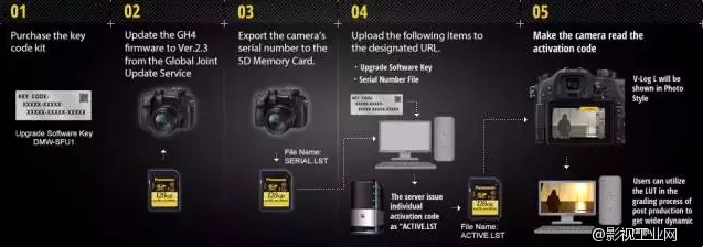 Purchase the key code kit DMW-SFU1 from this page. This is not for immediate download, as its kit that will be shipped to you.Update a fully charged LUMIX GH4 with firmware Version 2.3 from the Global Joint Update Service. Click here to download.Export the camera’s serial number to an SD Memory Card by inserting the SD card into the camera and press [Menu] -> [Setup] -> [Activate] -> [Export Serial Code] to save serial code as "SERIAL.LST" file.Upload the SERIAL.LST file by inserting the SD card into your computer. From the Update Portal Web Page use BROWSE to find and select "SERIAL.LST" file on the SD card. "SERIAL.LST" is saved in folder of PRIVATE > PANA_GRP > PAVC > LUMIX > ACTV > "SERIAL.LST then press [Upload] to proceed.Input "Key Code" from the kit you purchased in "Upgrade Software Key" to this website to get activation code. [ Alphabet on key code must be big letter to input. Please be careful with misspelling such as 1 (one ) and I ( big letter of "i") or 0 (zero) and O ( big letter of "o") Please input key without hyphen (-). ] Click RegisterACTIVE.LST should auto download from the site. Save this file to the SD card in the folder PRIVATE > PANA_GRP > PAVC > LUMIX > ACTV . insert the SD card into the same fully charged LUMIX GH4 and press [Menu] -> [Setup] -> [Activate] -> [Import Activation Code]When prompted power cycle the camera. You will find your new V-LOG L feature under the Menu “Photo Style”.